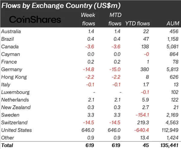 Майже весь приплив забезпечили інституціонали з США — $646 млн. Інвестори з Європи, Азії та Канади були більш стриманими: відтік у цих регіонах становив $23,8 млн, $2,2 млн і $3,6 млн відповідно.