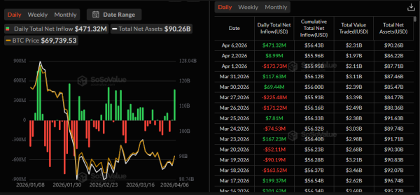Протягом торгової сесії 6 квітня американські спотові біржові фонди на базі першої криптовалюти отримали $471 млн. Це найбільший приплив з 25 лютого ($507 млн).