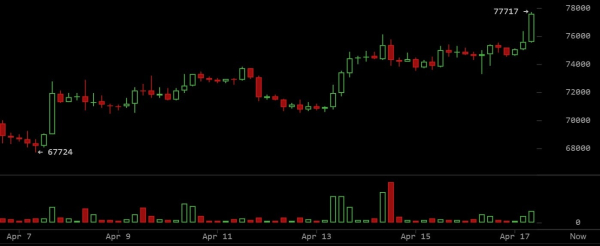 О 9:54 ранку 17 квітня біткоїн торгується на рівні 77 765 доларів, продовжуючи зростання після досягнення 24-годинного максимуму 77 717 доларів. Цей рух відображає посилення імпульсу: за останні 24 години біткоїн зріс на 5,69%. Динаміка цін демонструє явне перевищення меж попередньої консолідації, оскільки покупці ведуть ринок до нових локальних максимумів за обмежених ознак негайного відкату.
