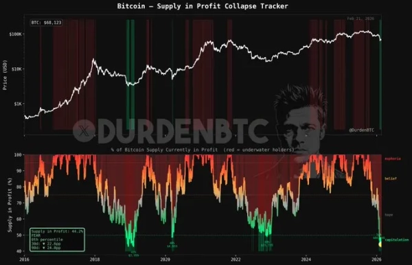 Selon l'analyste DurdenBTC, la part de l'offre de Bitcoin qui génère des profits se situe au zéro pour centile.