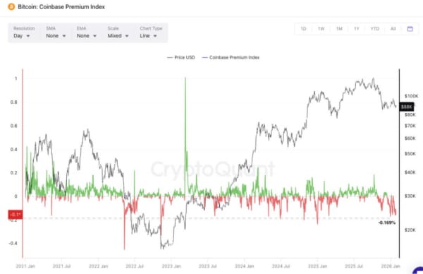 Un indicateur largement suivi, l'indice Coinbase Bitcoin Premium Rate, est resté négatif pendant de longues périodes en janvier et s'est récemment négocié autour de -0,16 %, indiquant que les prix au comptant américains sont inférieurs à la moyenne mondiale.