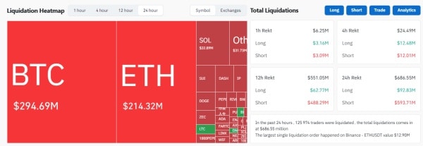Le volume quotidien des liquidations dépasse 686 millions de dollars, presque entièrement des positions courtes. Au total, près de 126 000 traders ont été contraints de réduire leurs positions.