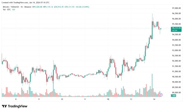 Le soir du 13 janvier 2026, la plupart des crypto-actifs affichaient une tendance positive. Le Bitcoin, en particulier, a brièvement atteint 96 500 $ avant de reculer, selon TradingView.