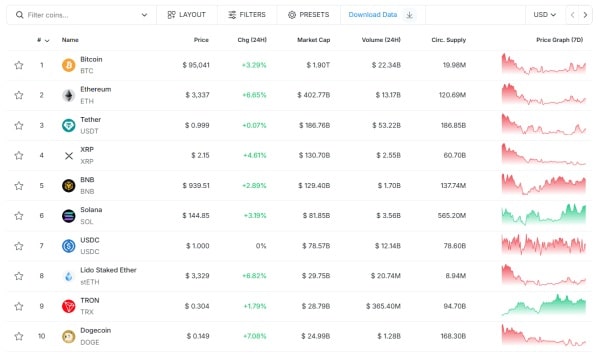 Les 10 principales cryptomonnaies par capitalisation boursière. Source : CryptoRank.