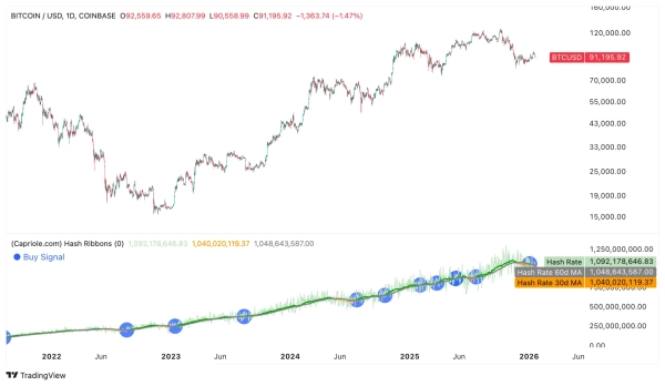 L'indicateur Hash Ribbons a généré un signal d'achat. Il a été déclenché lorsque la moyenne mobile à 30 jours du taux de hachage est passée sous sa moyenne mobile exponentielle (EMA) à 60 jours.