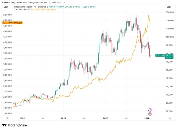 Dynamique hebdomadaire du BTC /USD par rapport au XAU/USD. Source : TradingView.