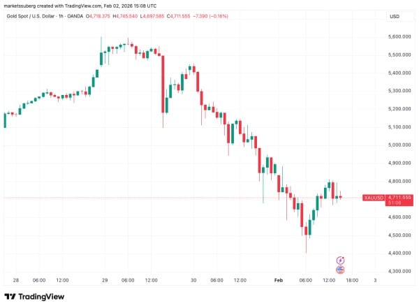 Après des mois de dynamiques divergentes, le Bitcoin et l'or ont temporairement évolué dans une direction similaire. Selon les analystes, l'or, qui avait précédemment atteint de nouveaux sommets historiques, a connu une forte correction et tente de se stabiliser autour de 4 700 dollars l'once.