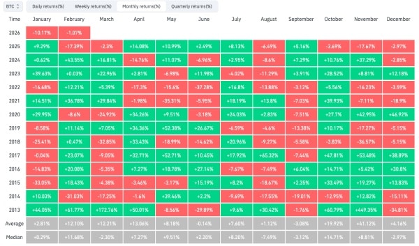 Rentabilité du Bitcoin par mois. Source : CoinGlass.