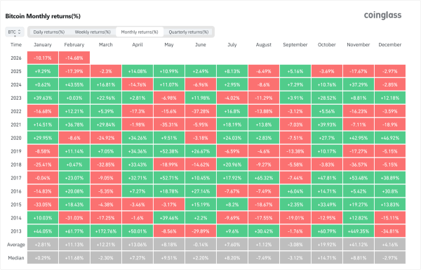 Février a été statistiquement positif pour le prix du Bitcoin. Avant 2026, on ne comptait que trois périodes où le prix a clôturé le mois en baisse. En 2014, il a chuté de 31 %, en 2020 de près de 9 % et en 2025, la perte a dépassé 17 %.