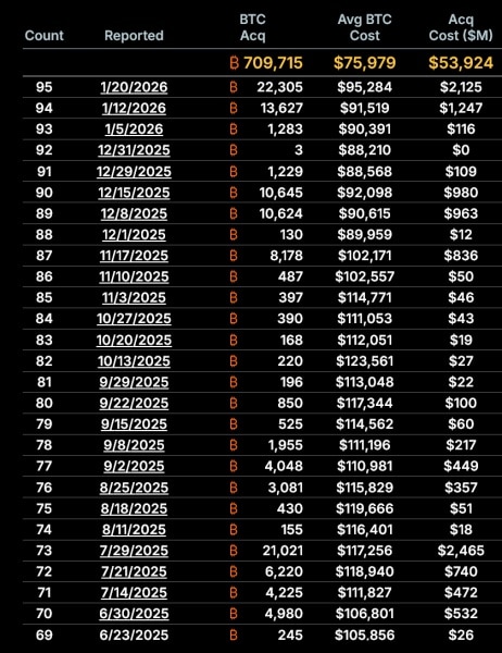 Mardi, Strategy a annoncé l'acquisition de 22 305 bitcoins, d'une valeur d'environ 2,13 milliards de dollars. L'entreprise contrôle désormais 709 715 bitcoins.