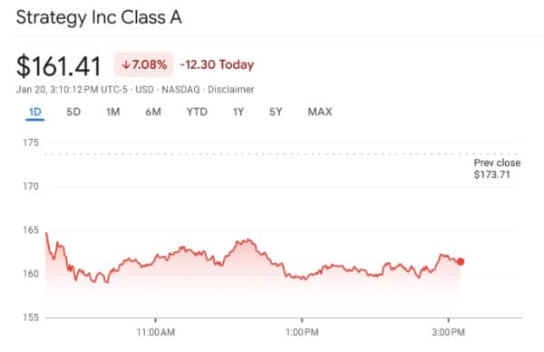 L'action Strategy a chuté de 7,39 % en 24 heures. À l'heure où nous écrivons ces lignes, l'action MSTR se négocie à 160,87 $.