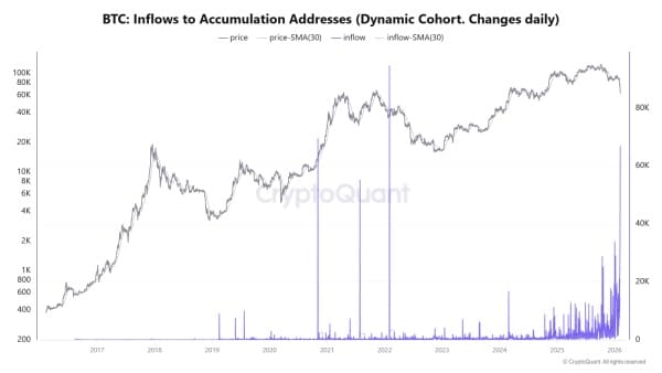 Le 6 février, 66 940 dollars en BTC sont arrivés sur les adresses des baleines, soit le plus important afflux de fonds de ce cycle, selon les estimations de CryptoQuant.