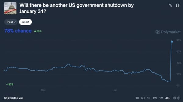 Les plateformes de paris donnent une probabilité de 78 % (Polymarket) et de 83 % (Kalshi) d'une fermeture du gouvernement américain d'ici le 31 janvier 2026.
