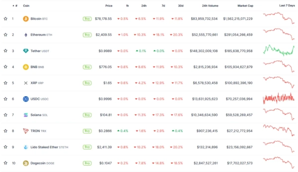 Le Bitcoin a touché son point le plus bas à un peu plus de 75 000 $, un niveau jamais atteint depuis avril 2025. Au moment de la rédaction de cet article, l’actif s’est redressé et se négocie aux alentours de 78 000 $.