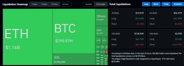 Selon CoinGlass, les liquidations des dernières 24 heures ont totalisé 2,6 milliards de dollars. La quasi-totalité de ce montant, à l'exception de 163 millions de dollars, provenait de positions longues.