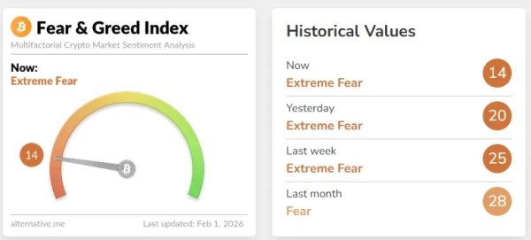 L'indice de peur et d'avidité lié aux cryptomonnaies est tombé à 14 points pour la première fois depuis mi-décembre 2025.