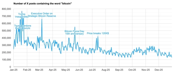 En 2025, le nombre de publications sur la plateforme de médias sociaux X contenant le mot « Bitcoin » a chuté de 32 % pour atteindre 96 millions, selon Jameson Lopp, cofondateur et directeur technique de Casa.