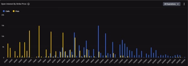 Bien que l'option de vente à 75 000 $ soit la stratégie baissière la plus populaire, on observe également un intérêt ouvert important pour les options de vente avec des prix d'exercice de 70 000 $, 80 000 $ et 85 000 $, alors qu'il n'y a pas d'activité similaire pour les options d'achat avec des prix d'exercice plus élevés, à l'exception de 100 000 $.