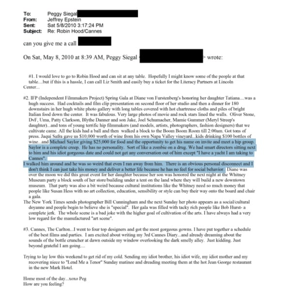 « Michael Saylor a donné 25 000 dollars pour payer les repas afin de figurer sur la liste des invités et de rencontrer le milieu de la mode. Saylor est vraiment un type répugnant. Il n’a aucune personnalité. C’est comme un zombie sous l’emprise de drogues », peut-on lire dans la lettre adressée à Epstein.