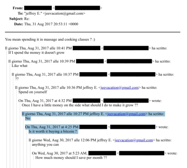 Cependant, son intérêt portait principalement sur le profit à court terme, et non sur l'idéologie ou le stockage à long terme. Dans un courriel, Epstein a catégoriquement déconseillé l'achat de bitcoins.