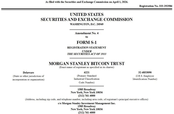 Morgan Stanley, глобальний інвестиційний банк і компанія з управління активами, 1 квітня подав до Комісії з цінних паперів та бірж США (SEC) поправку № 4 до реєстраційної заяви за формою S-1 для Morgan Stanley Bitcoin Trust, в якій виклав плани з лістингу біржового фонду (ETMS) на NYMS. У заявці описується пасивний інструмент, призначений для відстеження динаміки цін на біткоїн з використанням еталонного індексу.