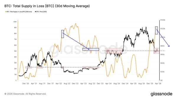 Індикатор загальної кількості монет, що перебуває у збитку, демонструє структурну схожість із умовами другого кварталу 2022 року. Згладжений 30-денний показник перевищив рівень 8,4 млн . $BTC .