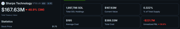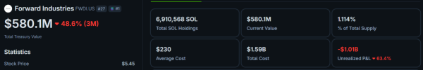 Найбільший власник, Forward Industries, придбав 6,9 млн SOL за середньою вартістю $230. «Паперовий» збиток компанії перевищив $1 млрд.