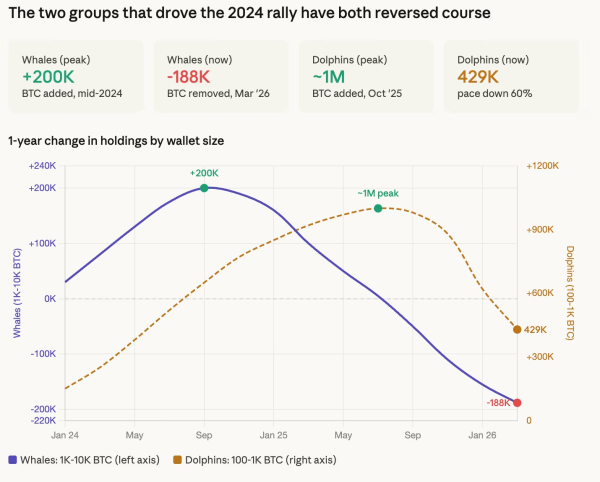 Великі інвестори з балансами від 1000 до 10 000 $ BTC змінили стратегію та стали головними продавцями. У CryptoQuant вважають поточну фазу розподілу однієї з найагресивніших за всю історію спостережень.