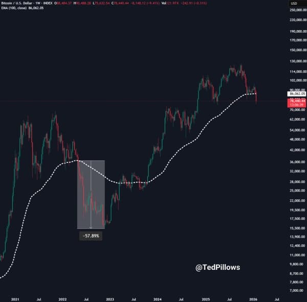 Comme l'a souligné Ted Pillow, le Bitcoin a clôturé la semaine sous sa moyenne mobile exponentielle à 100 jours (MME 100) pour la première fois depuis longtemps. La dernière fois, cela faisait suite à une chute de 58 %.