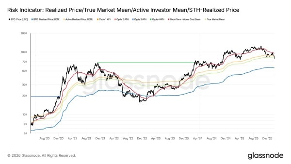 Les données de Glassnode confirment la gravité de la situation. Alors que le Bitcoin s'échange actuellement à 78 600 $, les principaux modèles de prix on-chain restent plus élevés :