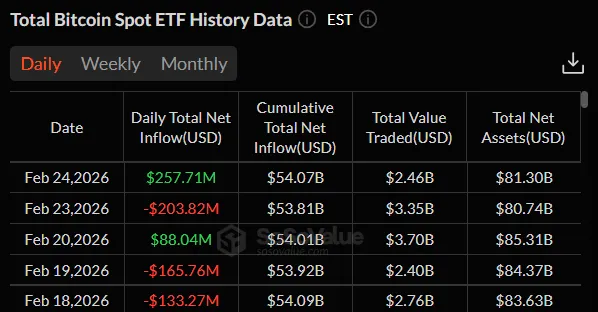 Незважаючи на масові продажі наприкінці минулого року, 24 лютого чистий потік коштів у спотові біткоїн-ETF склав $257,71 млн. Найбільше капіталу залучив фонд FBTC від Fidelity — $82,8 млн.