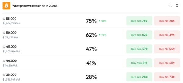 Близько 75% учасників платформи передбачень Polymarket переконані, що ціна біткоїна знизиться до $55 000. Обсяг ставок на цей варіант розвитку подій сягає $1,2 млн.