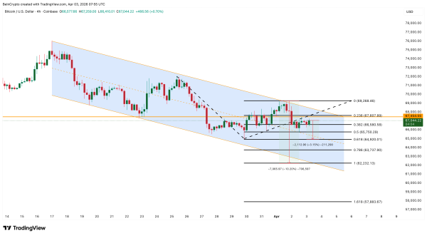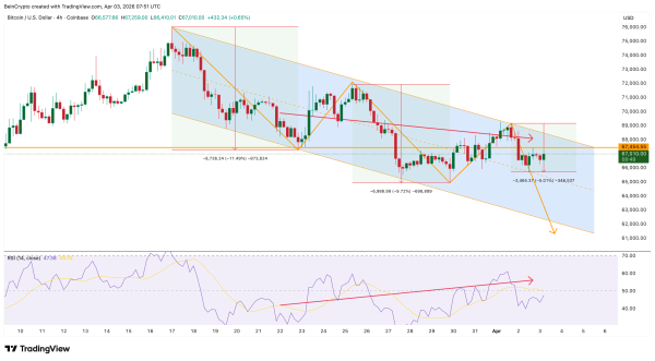 Третього квітня біткоїн торгується біля позначки $67 044. На чотиригодинному графіку актив знаходиться всередині паралельного каналу. Ця структура визначає всі цінові коливання із 17 березня. Канал вже сформував два різкі зниження за схожим сценарієм.