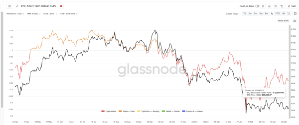 Перше падіння склало 11,49%, друге – 9,72%. Наразі формується третя хвиля від локального максимуму початку квітня. Актив уже втратив близько 5%. Прихована ведмежа дивергенція індексу RSI вказує на можливість продовження корекції. Мережеві дані свідчать про відсутність глибокої капітуляції короткострокових інвесторів. Це залишає простір подальшого падіння ціни биткоина.
