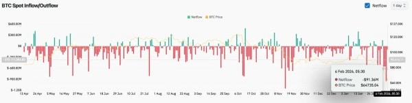 Les données de Coinglass indiquent des sorties de capitaux au comptant de 91,36 millions de dollars au 6 février, amplifiant la forte distribution observée la semaine dernière. Ces trois derniers jours, les sorties de capitaux au comptant ont frôlé les 2 milliards de dollars, les retraits institutionnels d'ETF s'accélérant parallèlement aux ventes au comptant.