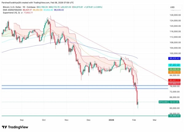 Un rebond de 60 001 $ à 64 670 $ représente un retracement de 7,8 %, qui doit se maintenir au-dessus de 63 000 $ pour signaler une stabilisation significative. Un échec de la ligne de tendance baissière entraînerait un nouveau test du plus bas à 60 000 $.