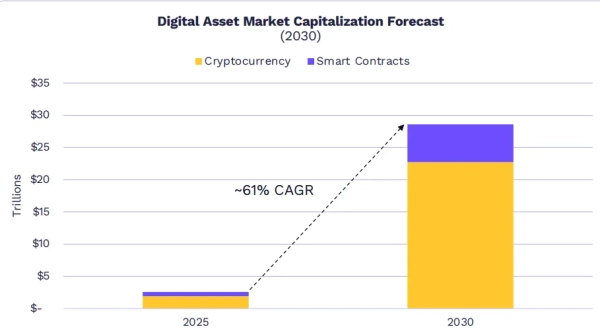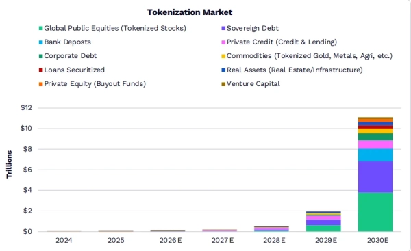 Найбільш амбітний прогноз відноситься до токенізації активів реального світу (RWA). Аналітики вважають, що обсяг даного ринку може перевищити $11 трлн. Зараз сегмент оцінюється в $19–22 млрд. Щоб досягти поставлених цілей протягом наступних п’яти років, сектору доведеться вирости приблизно на 50 000%.