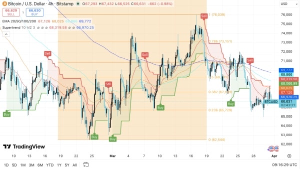 Біткоїн входить у квітень 2026 року під видимим тиском, оскільки рух цін намагається відновити висхідну силу. Ринок демонструє коливання біля ключового опору, тоді як продавці зберігають контроль у короткостроковій перспективі.