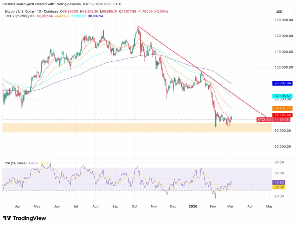 Всі чотири EMA залишаються нижчими за недавні максимуми: 20-денний — $68,307, 50-денний — $74,431, 100-денний — $82,106, а 200-денний — $90,097, утворюючи сходи сходу опору. Низка лінія тренду (червона лінія) завершила зростання з листопадових максимумів 2025 близько $130,000.