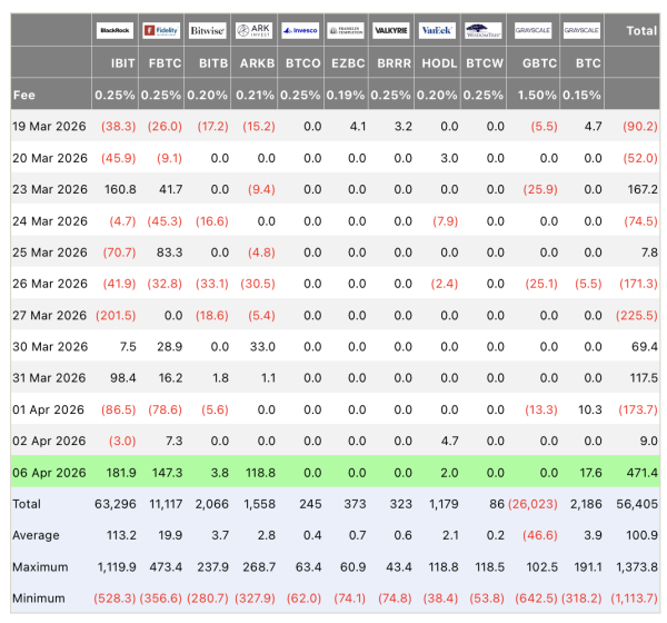 Приплив капіталу в біткоін-ETF досяг $471 млн 6 квітня — це найвищий показник із лютого і пряма вказівка на повернення інституційного інтересу до активу.