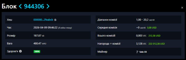 Одинокий майнер з хешрейтом лише 70 TH/s виявив блок під номером 944 306 у блокчейні біткоїна. Нагорода склала 3,128 BTC ($222 074).