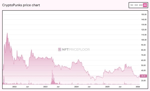 Мінімальна ціна найвідоміших колекцій знизилася на десятки відсотків. На вершині вартість CryptoPunks становила 113,9 ETH, проте на час написання впала до 28,3 ETH.