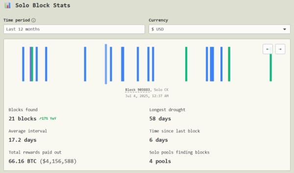 За даними агрегатора Bennet, в середньому індивідуальні блоки знаходять приблизно раз на 17,2 дні. Разом з тим, число подібних випадків збільшується. Протягом останнього року 21 індивідуальний майнер успішно відшукав блок.