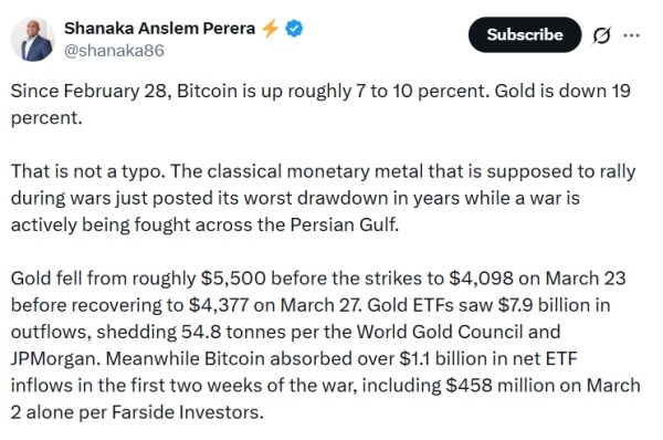 Справді, дані ринку під час останніх геополітичних подій показують, що динаміка $BTC і золота різниться. За даними аналітика Шанакі Анслем Перери, з 28 лютого біткоїн виріс на 7–10%, тоді як золото подешевшало на 19%. Ціни на дорогоцінний метал впали приблизно з $5,500 до початку конфлікту до $4,098 на 23 березня, а до 27 березня відновилися до $4,377.