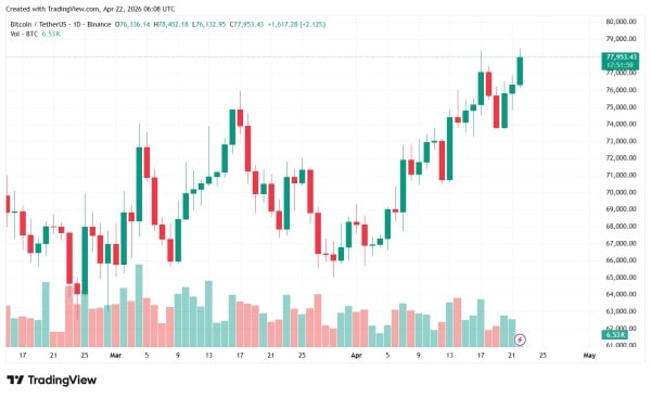 Рано вранці 22 квітня 2026 року біткоїн відзначився зростанням, досягнувши в моменті $78 452, згідно з TradingView. Висхідний тренд, ймовірно, підживлюється деескалацією конфлікту на Близькому Сході.