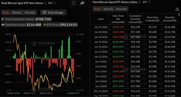 À la clôture de la dernière séance de bourse, les ETF au comptant américains basés sur le Bitcoin ont perdu 708,7 millions de dollars, ce qui représente la plus importante sortie de capitaux en une seule journée depuis deux mois.