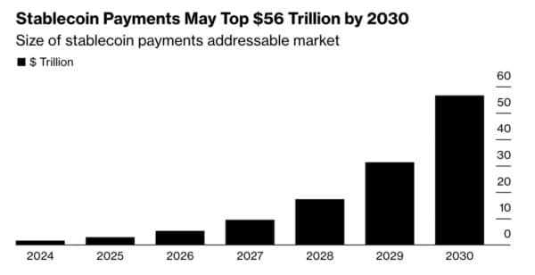 Згідно з прогнозом аналітиків Bloomberg Intelligence, сукупний обсяг сегмента стейблкоїнів може досягнути $56 трлн до 2030 року.