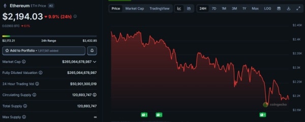 Інвестор вийшов з операції на фоні падіння ринку. За останню добу курс другої за розміром капіталізації криптовалюти впала орієнтовно на 10%, знизившись до $2194.