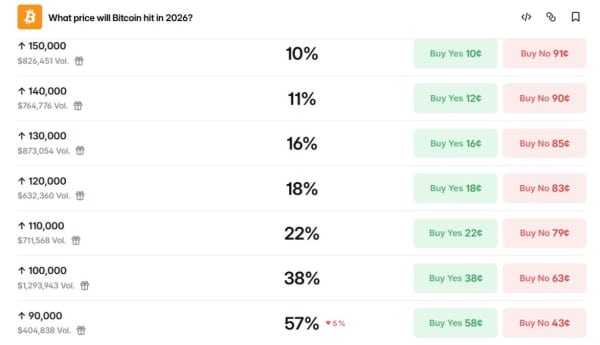 Проте, зважаючи на зроблені на ринку прогнози Polymarket ставки, шанс зростання вартості криптовалюти навіть до $126,000 досить малий. Про це говорить той факт, що ймовірність підвищення ціни монети до $120,000 оцінюється лише у 18%.