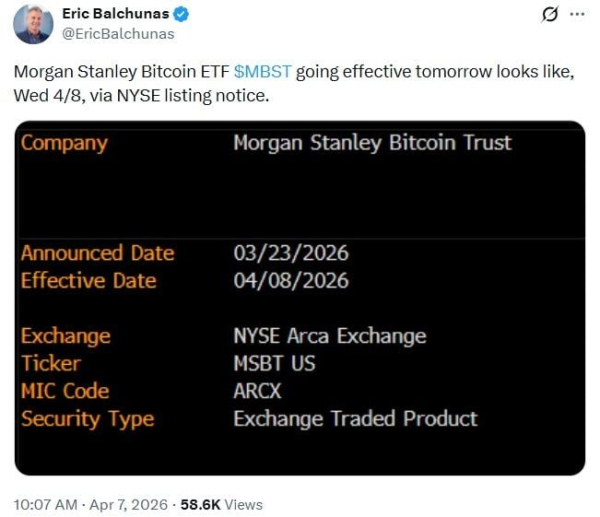 Очікування посилюються у міру того, як Morgan Stanley наближається до запуску свого біржового фонду (ETF) на біткоїні з певними деталями структури та термінів. Аналітик Bloomberg Intelligence Ерік Балчунас повідомив 7 квітня в соціальній мережі X, що біткоін-ETF компанії наближається до запуску. У своїх повідомленнях він вказав конкретну дату набуття чинності та висловив очікування щодо короткострокових прогнозів щодо активів.